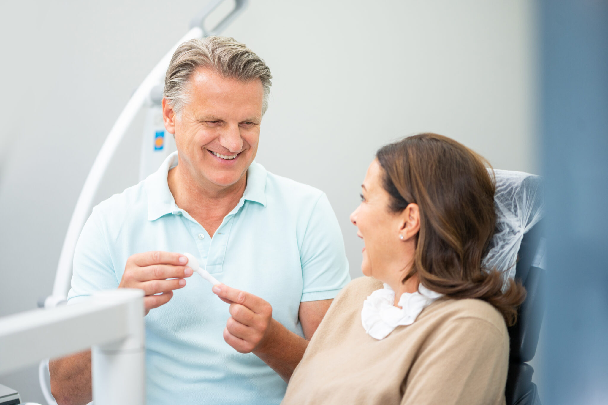 Der Arzt zeigt einer Patientin anhand eines Gebiss Models wie eine Zahnreinigung funktioniert